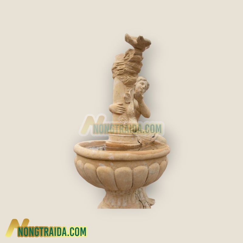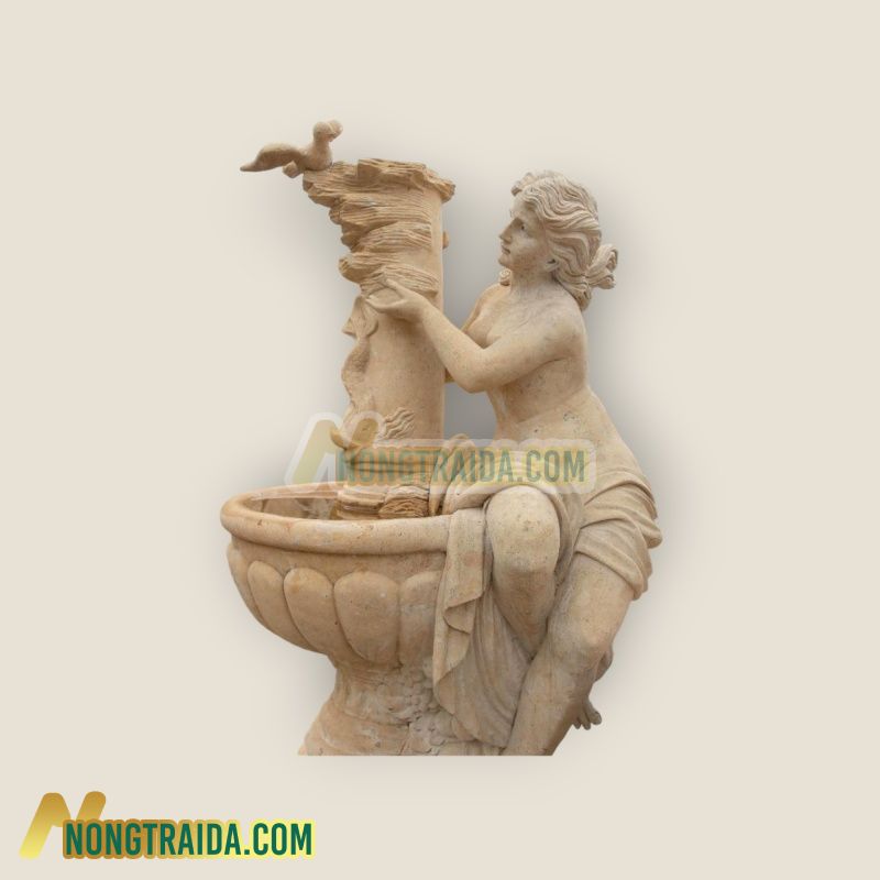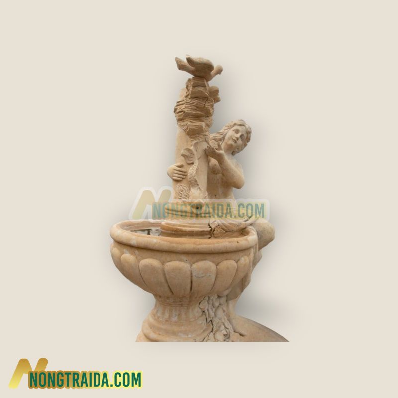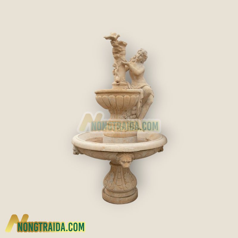 Đài phun nước 2 tầng được làm bằng đá vôi nâu là một tác phẩm nghệ thuật tinh xảo trong kiến trúc truyền thống của Việt Nam. Với kích thước lớn 250x130cm, đài phun nước này không chỉ là một công trình trang trí mà còn mang đậm giá trị văn hóa và nghệ thuật. Tầng đầu tiên của đài phun nước được thiết kế với vòi phun hình đầu sư tử, biểu tượng của sức mạnh và quyền lực trong văn hóa Á Đông. Sư tử thường được coi là linh vật bảo hộ, biểu tượng cho sự uy nghi và bền vững. Việc chọn hình ảnh sư tử để trang trí trên đài phun nước không chỉ tôn vinh giá trị truyền thống mà còn gợi nhắc về sự mạnh mẽ, quyết đoán. Tầng thứ hai của đài phun nước là nơi trưng bày tác phẩm điêu khắc phụ nữ cùng chim trên đỉnh. Phụ nữ trong nghệ thuật thường được biểu hiện dưới hình ảnh của sự dịu dàng, tinh tế và sắc sảo. Khi kết hợp với hình ảnh chim, tác phẩm này có thể truyền đạt thông điệp về sự giao thoa giữa con người và thiên nhiên, sự thanh thoát và tinh tế trong cuộc sống hàng ngày. Việc sử dụng đá vôi nâu làm chất liệu chính cho đài phun nước không chỉ tạo nên vẻ đẹp cổ điển mà còn đem lại sự sang trọng và độ bền cao cho công trình. Từ việc chọn lựa chất liệu đến việc tạo hình các chi tiết nhỏ, mỗi yếu tố trong đài phun nước này đều được chăm chút tỉ mỉ, tạo nên một tác phẩm nghệ thuật độc đáo và ấn tượng. Với sự kết hợp hài hòa giữa hình ảnh sư tử, phụ nữ và chim cùng với chất liệu đá vôi nâu tinh xảo, đài phun nước 2 tầng này không chỉ là một công trình trang trí mỹ thuật mà còn là biểu tượng của sự kỳ diệu và tinh tế trong nghệ thuật kiến trúc Việt Nam. Bard
